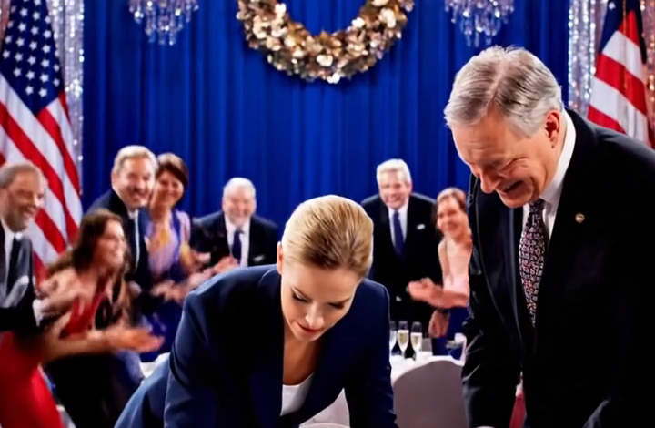 Brenda legde eindelijk haar telefoon neer, haar gezicht kreeg een geoefende, serieuze uitdrukking. Ze ging naast hem staan – een front van eenheid.
